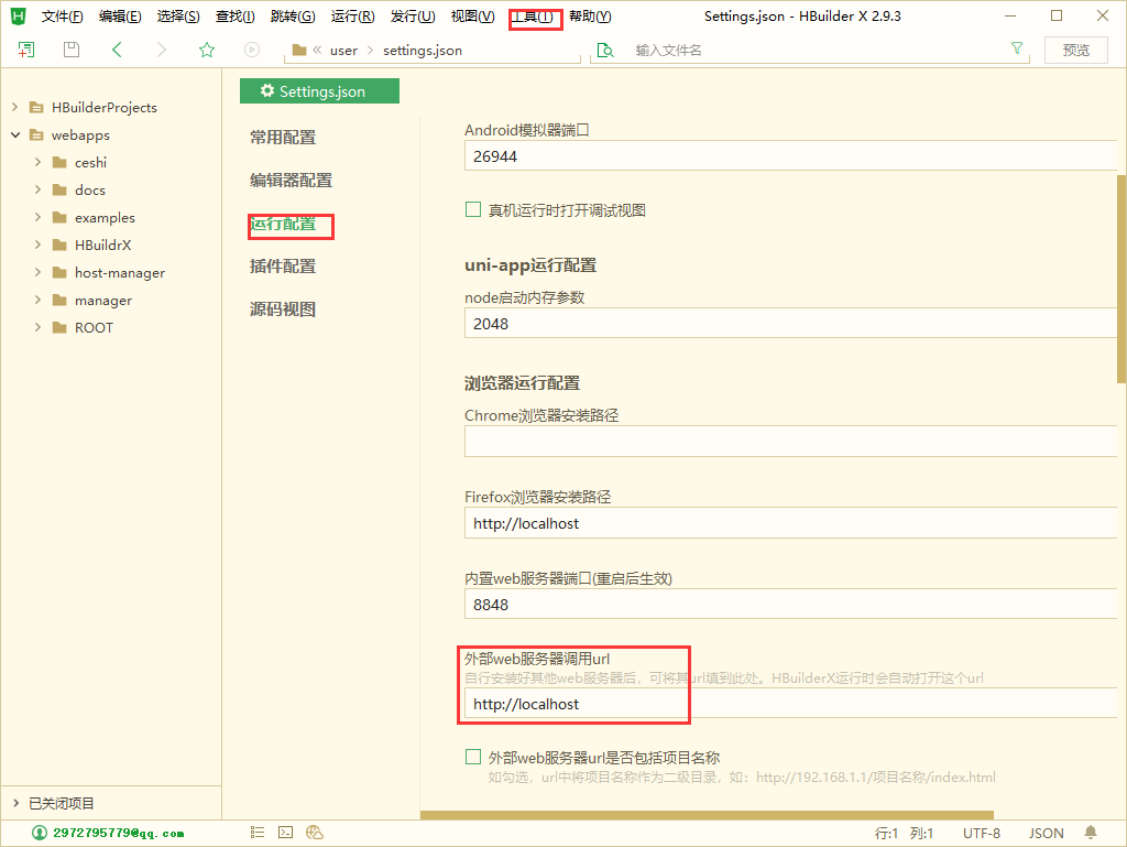 打开工具设置,找运行设置,外部web服务器调用url,输入后面的端口号是自己tomcat的默认端口,如果没有修改过就是8080,我因为修改成80端口(80端口可不写),所以配置中并未填写,注意下面的选项,外部web服务器url是否包含项目名,如果你在引入时没有引到webpps这一级目录,而是他的下一级目录则需要勾选。