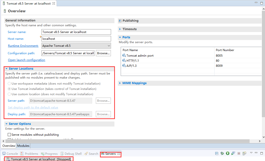 - 原因是我们刚才在eclipse中设置的server locations路径为: use workspace metadata,你在eclipse中启动的tomcat并部署项目的时候,其实是eclipse调用了tomcat核心的组件,内置到eclipse中,启动和部署的时候跟真正的tomcat毫无关系,因此当你在浏览器中输入 显示没有启动,但是输入项目名 之后, 直接进入了eclipse的内置的tomcat,因此能预览。
