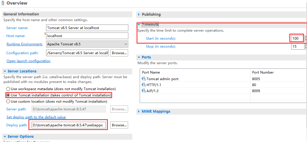 双击下方的tomcat,进入配置页面,我们发现server locations 是灰的,没关系,我们只需要移除tomcat下的项目并clean就可以进行配置,具体操作为右键tomcat,有add and remove 以及clean。清除成功后,我们选择中间的选项 use tomcat installation,真正部署到tomcat下,在deploy path 选择tomcat下的webapps目录,最后我们可以设置右上角的timeouts为100防止项目过大启动时间长,判断响应超时,最后的最后保存。