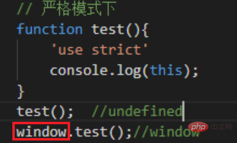直接test()调用函数,this指向undefined,window.test()调用函数this指向window。因此,在严格模式下, 我们对代码的的调用必须严格的写出被调用的函数的对象,不可以有省略或者说简写。