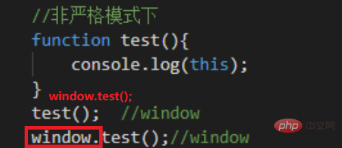 非严格模式下,通过test()和window.test()调用函数对象,this都指向window。