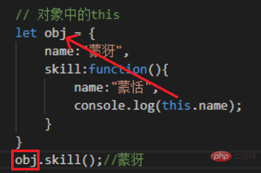 调用obj.skill()方法,返回值为蒙犽,说明此时this指向obj。