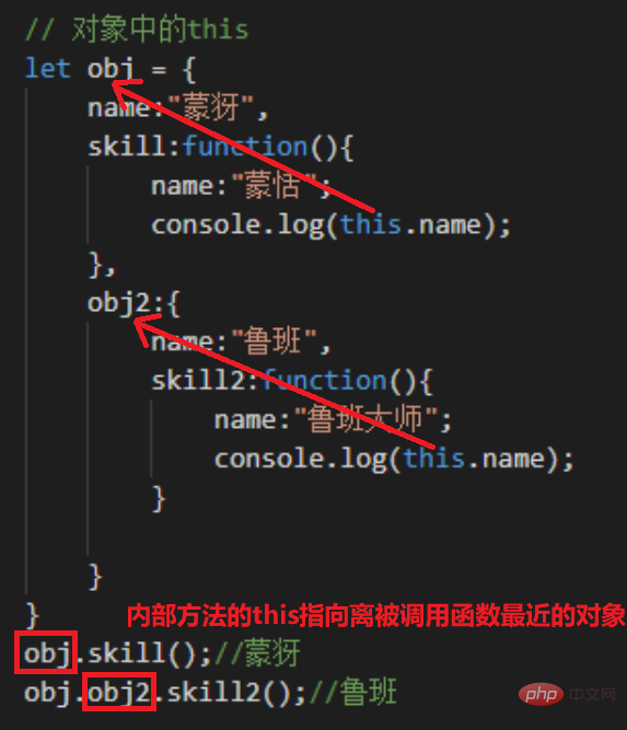 调用skill2()方法的顺序为,obj.obj2.skill2() ,返回值为鲁班,说明skill2()方法中的this指向obj2。