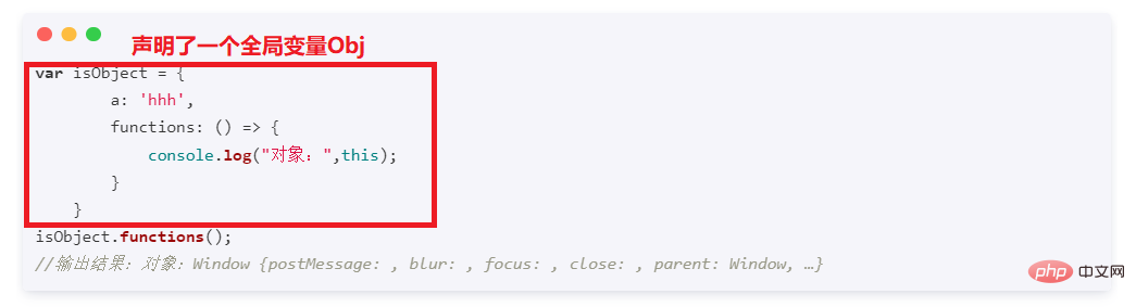 - 声明的是全局变量Obj,this指向箭头函数所在全局作用域的对象,即indow对象。
