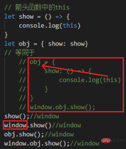 window.show()返回值是window,所以this此时指向window;window.obj.show(),obj是对象,非箭头函数,所以找到这里就停止了,this绑定到obj上。window调用obj,所以obj中的this也指向window。