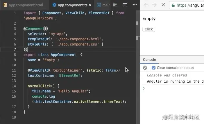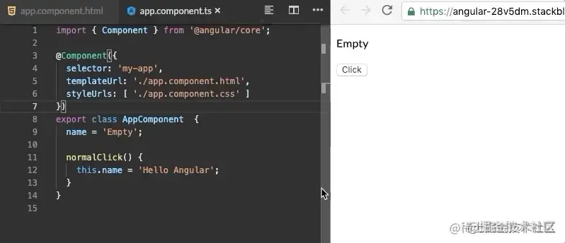 如果我们用原生JS来编写这段代码,那么点击按钮后的视图肯定不会发生任何变化,而在Angular中却让视图发生了变化,那它为什么会自动把视图更新了呢?这离不开一个叫做zone.js的库,简单来说,它是对发生值改变的事件做了一些处理,这个会在后面的部分详细讲解,这里暂时知道这个就可以了。