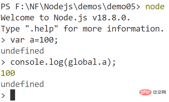 (3)、在Node.js的交互环境下,定义的变量属于global,global是类似浏览器端的window对象