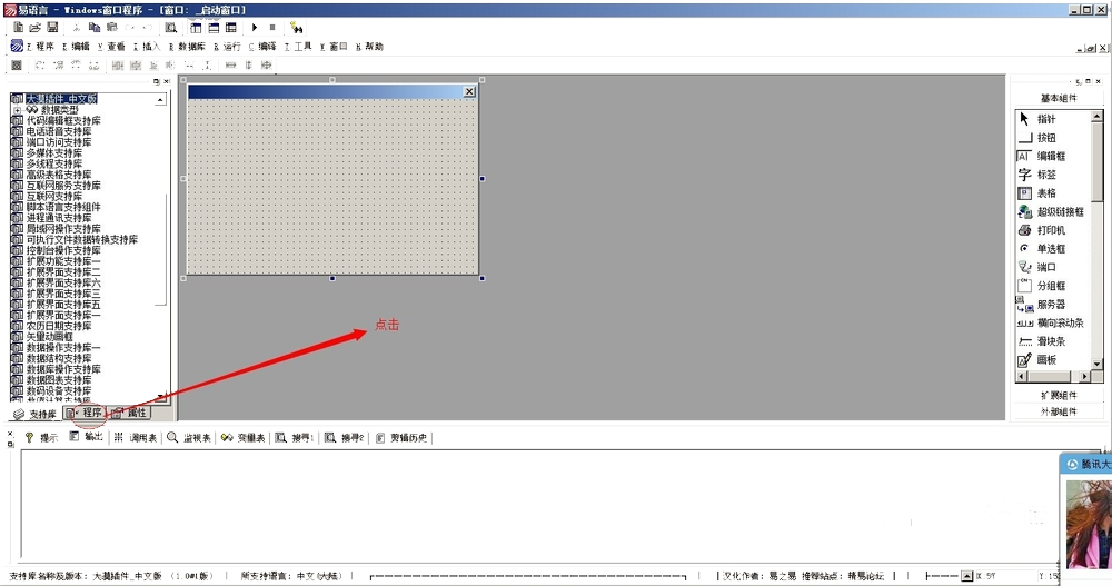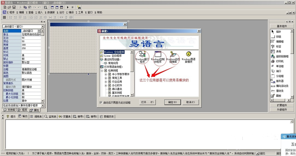 1、打开易语言,里面,窗口程序、控制程序、动态连接库、易语言模块。