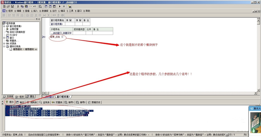 4、点击提示看下参数,如果有5个参数就点4个逗号。易语言不会给调用的模块定义参数。必须自己点逗号定义。。