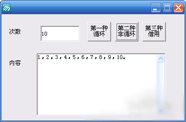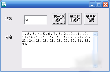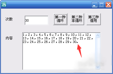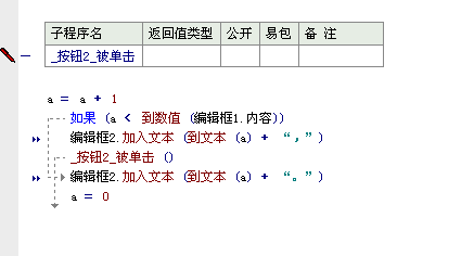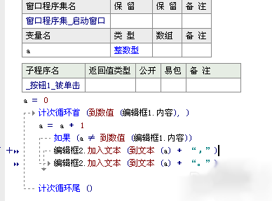 .版本 2 .子程序 _按钮2_被单击 a = a + 1 .如果 (a < 到数值 (编辑框1.内容)) 编辑框2.加入文本 (到文本 (a) + “,”) _按钮2_被单击 () .否则 编辑框2.加入文本 (到文本 (a) + “。”) a = 0