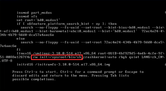 进入后,找到linux16 开头的一行!按向右的方向键,定位到ro 然后修改ro为rw,并添加如下红框内的命令行!