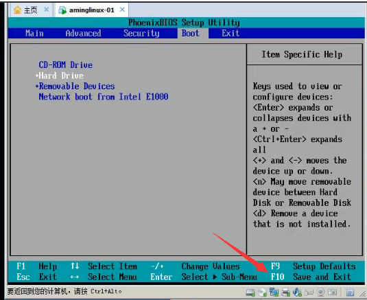 然后通过上下箭头调节CD-ROM至第一启动项,按F10保存: