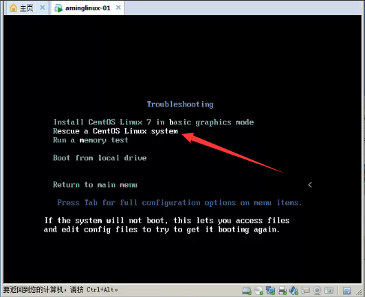 选择救援模式--Rescue a CentOS Linux system: