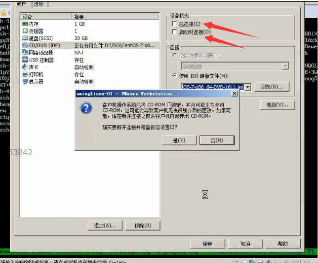 然后我们再次点击编辑咱们的虚拟机,把DVD设备状态断开如下所示,或者进入BIOS恢复启动即可!