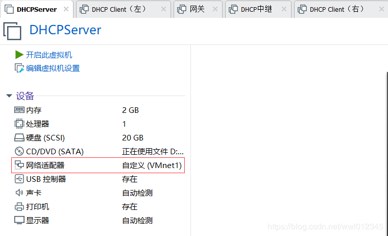 (2)将DHCP Server和左边的DHCP Client的网络适配器设置为自定义(VMnet1)