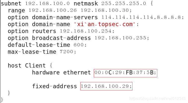 说明一下:00:0C:29:FB:37:5B是左边的客户机的硬件地址,192.168.100.29是保留的IP地址。