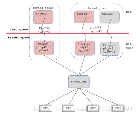 用户态中,多线程会作为一个进程看待,在内核中,会被抽象为“线程组”。线程组中的task_struct有不同的pid字段,但是会有相同的tgid(threadgroup id)字段,这个tgid作为用户态进程的pid给上层使用。所以,在一个进程下的每个线程中获取到的pid是相同的,用户态的pid与内核态的pid不是同一个东西,想获取线程在内核态的pid可以通过系统调用(gettid)来获取。线程组中的task_struct会通过一个链表(thread_group)链接起来,后面创建的线程的task_struct中的group_leader字段会指向leader。通过共享mm_struct、fs、signal相关的数据,再通过thread_group相关的设置,线程的概念基本就实现了
