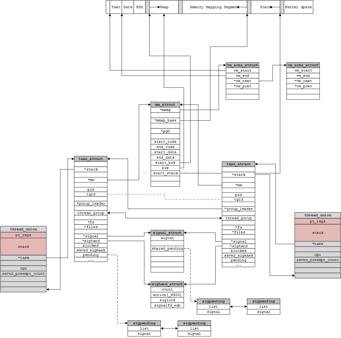 不管是通过fork产生的进程还是通过pthread_create产生的线程,其在内核中都对应着一个task_struct,linux_structure图中有两个task_struct,其中右边的task_struct是通过pthread_create产生的,因此左边的task_struct是threadgroup的leader。task_struct有很多字段,其中mm就是用来描述虚拟地址空间的。我们可以看到两个task_struct的mm指向了同一个mm_struct对象,也就是前面提到的线程间共享同一个虚拟地址空间。