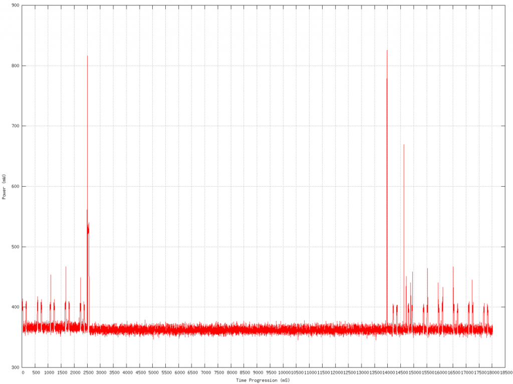 如上所示,有两个 gpio 键被配置为唤醒源,在系统挂起期间,其中任何一个键被按下都会产生一个唤醒事件。 可替代 DT 文件配置的另一个唤醒源配置就是设备驱动,如果设备驱动自身在代码里面配置了唤醒支持,那么就会使用该默认唤醒配置。 实施冻结功能如果系统希望能够充分使用挂起到空闲,那么应该在 CPU 空闲驱动代码中定义 enter_freeze() 函数。enter_freeze() 与 enter() 的函数原型略有不同。因此,不能将 enter() 同时指定给 enter 和 enter_freeze。至少,系统会直接调用 enter()。如果没有定义 enter_freeze(),系统会挂起,但是不会触发那些只有当 enter_freeze() 定义了才会触发的函数,比如 tick_freeze() 和 stop_critical_timing() 都不会发生。这会导致计时器中断唤醒系统,但不会导致系统恢复,因为系统处理完中断后会继续挂起。 在挂起过程中,中断越少越好(最好一个也没有)。 下图显示了能耗和时间的对比。图中的两个尖刺分别是挂起和恢复。挂起前后的能耗尖刺是系统退出空闲态进行记录操作,进程调度,计时器处理等。因延迟的缘故,系统进入更深层次空闲状态需要花费一段时间。