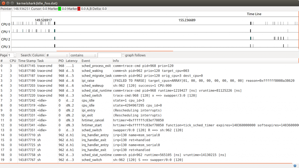 能耗使用时序图 下图为 ftrace 抓取的 4 核 CPU 在系统挂起和恢复操作之前、之中和之后的活动。可以看到,在挂起期间,没有请求或者中断被处理。