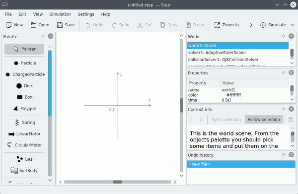 Step 是一个交互型物理模拟器,属于 KDEEdu(KDE 教育)项目的一部分。没人会比它的作者更了解它的作用。在项目官网主页上写着“[Step] 是这样玩的:你放点东西进来,添加一些力(地心引力或者弹簧),然后点击‘模拟(Simulate)’按钮,这款软件就会为你模拟这个物体在真实世界的物理定律影响下的运动状态。你可以改变物体或力的属性(允许在模拟过程中进行修改),然后观察不同属性下产生的现象。Step 可以让你从体验中学习物理!”