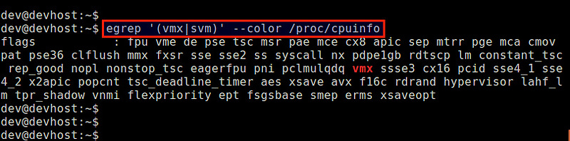 $ egrep '(vmx|svm)' --color /proc/cpuinfo