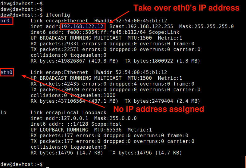 如果因为某些原因,eth0 仍然保留了之前分配给了 br0 的 ip 地址,那么你可能必须手动删除 eth0 的 ip 地址。