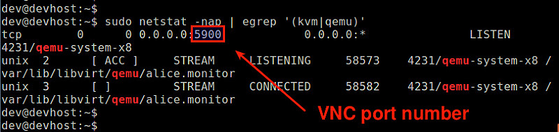 $ sudo netstat -nap | egrep '(kvm|qemu)'