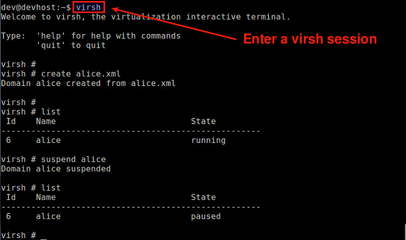 在 virsh 提示中,你可以使用任何 virsh 命令。