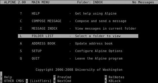 要在终端中发送邮件,我们首先要选择对应工具。很多人推荐mutt与notmuch,二者确实非常强大,但我更偏爱alpine。它不仅效果良好,而且界面设计与Thunderbird等GUI邮件软件非常相似。