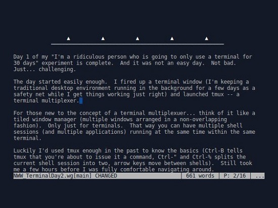 在纯文本界面当中,文本编辑器与文档处理器之间其实并无多大区别。在这方面,我个人推荐wordgrinder,其拥有诸多工具、良好的菜单驱动型界面(支持热键)并支持多种文件类型。