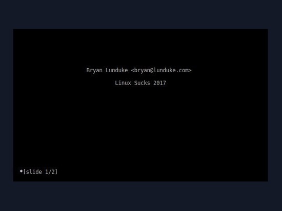 LibreOffice、谷歌Slides乃至PowerPoint,我们的日常生活总是与演示文稿息息相关。事实上,我们完全可以利用shell形式处理此类文稿,而凭借的正是“text presentation program”。其中无法显示任何图像,而仅包含幻灯片序列以及简单的标记语言。虽然无法插入图片,但作为科技爱好者,在终端中处理幻灯片也别有一番风味。