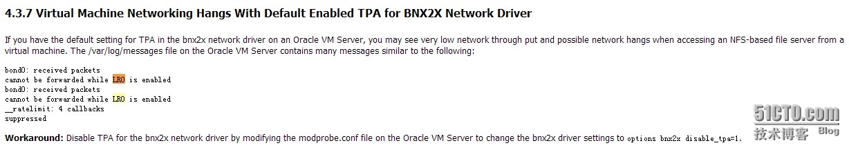 于是参考Oracle的解决方案,修改/etc/modprobe.conf文件,添加options bnx2x disable_tpa=1关闭网卡的TPA模式,重启网络服务问题得到解决...