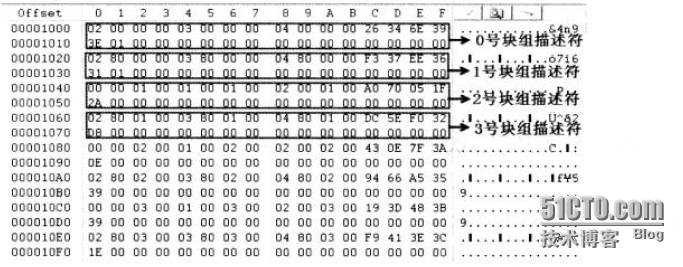 EXT3文件系统的块组描述符表起始于超级块下面的一个块,每个块组描述符占32个字节,多个块组描述符组成了块组描述符表。如下图:是使用“Winhex”打开的块组描述符表。