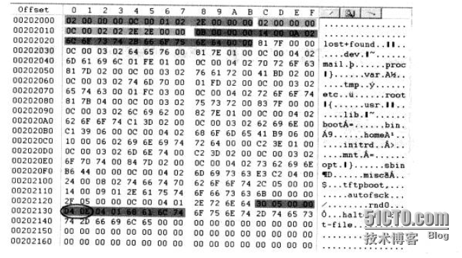 我们知道1~10号i节点为系统 保留,2号i节点被分配给根目录使用,所以我们找到2号i节点,根据i节点中的直接块指针可以找到根目录。