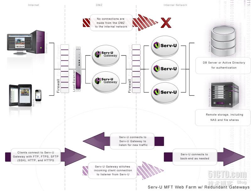 Serv-U Gateway 为Serv-U部署提供深层防御。该网关可以作为DMZ区域中的反向代理服务器,防止在Serv-U部署中将数据存储于DMZ区域中,还阻止从DMZ打开进入内部网络的链接(部署TOP图如下所示)。