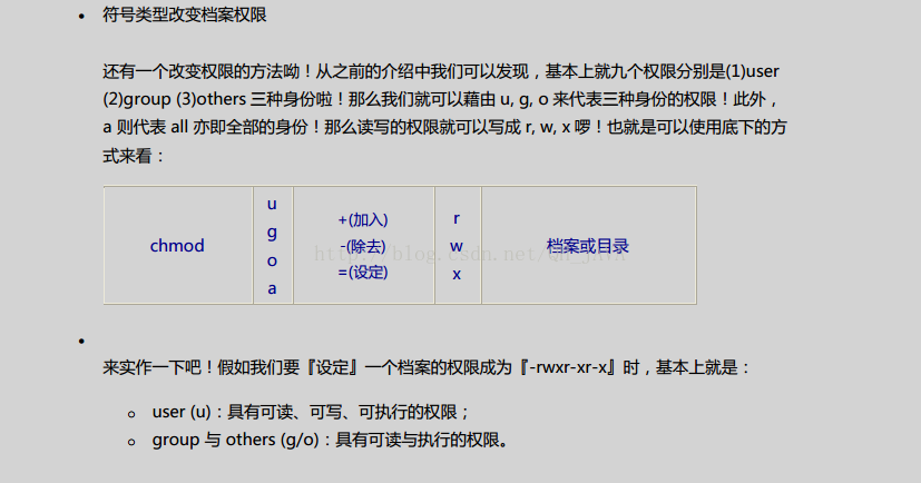 (7)、申明这个图来自鸟哥的私房菜 (8)、我们在上面使用的时候使用了= 那那个+ 号和 - 号的作用那,我满就来看看: chmod u+w filename 则表示这个档案的拥有着添加w这个权限 chmod u - w filename 则表示这个档案的拥有者失去了w这个权限 其中的 group other 和 user 是一样的 (9)、特殊字符 a 他代表着all的意思就是所有的即包括:user group other 这三个属性!