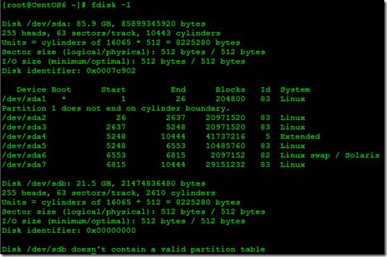 2、 然后我们在新添加的硬盘上创建逻辑分区,创建的命令使用fdisk /dev/sdb如图所示:是创建完成的分区,sdb6-sdb10是我们模拟raid分区来做的。每个分区是1G。