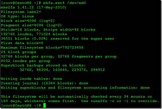 6、 Raid创建完成/dev/md0之后,我们格式化/dev/md0,这里我们需要注意的是,我们格式化的不是我们挂载的硬盘而是我们创建的块设备文件。如图: