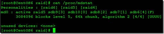 3、 然后我们在查看RAID5的工作方式的时候,发现sdb6后面有F,表示这个硬盘分区失败,让其他的硬盘替换掉了,如图: