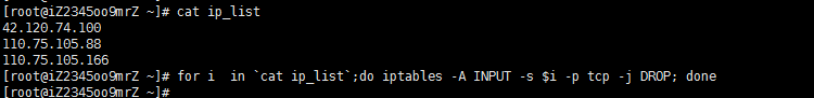 最后把汇总的恶意ip地址封禁即可 for i in `cat ip_list`;do iptables -A INPUT -s $i -p tcp -j DROP; done