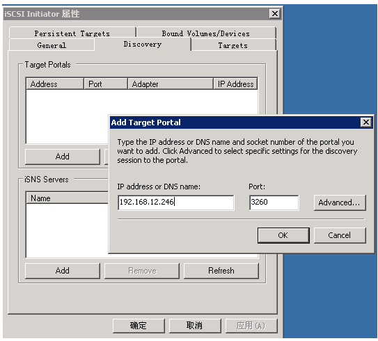 在此窗口下填写iSCSI Target的ip地址和端口,iSCSI Target地址就是上面设定的Target主机的地址,iSCSI Target的端口默认是3260,除非有特殊设定,填写完成,点击OK按钮。