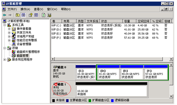 到此为止,windows系统已经识别了iSCSI Target提供的共享磁盘分区,通过windows的磁盘管理器可以看到新增加的磁盘分区,如图6所示: