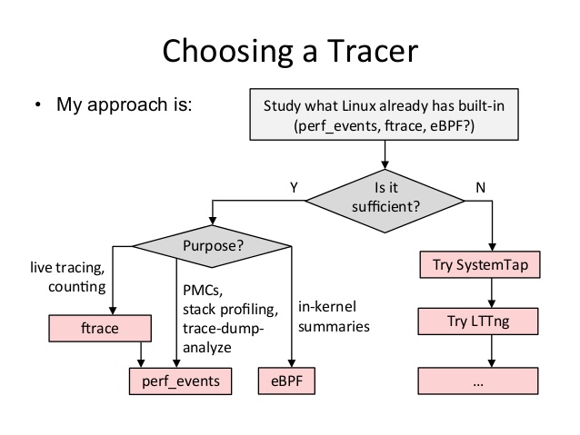 这里是我的建议,可以二选其一: A) 选中一个全能的跟踪器,并且使它标准化,这将涉及花费大量的时间去弄清楚它在测试环境中的细微差别和安全性。我现在推荐 SystemTap 的最新版本(可以从源代码构建)。我知道有些公司已经选用 LTTng,而且他们用的很好,尽管它不是非常的强大(虽然它更安全)。如果 Sysdig 可以增加追踪点或者 kprobes,可以做为另一个候选。 B) 遵循我上面提供的流程图,它将意味着尽可能更多的使用 ftrace 或者 perf_event, 并整合 eBPF,之后其他的跟踪器像 SystemTap/LTTng 会去填补剩下的空白。 这就是我目前在 Netflix 做的工作。 对跟踪器的评价1. ftrace我喜欢用 ftrace,它是内核 hacker 的首选,内置于系统内核,可以使用跟踪点(静态检查点),能调用内核 kprobes 和 uprobes 调试工具。并且提供几个这样的功能:带可选过滤器和参数的事件追踪功能;在内核中进行统计的事件计数和定时功能;还有函数流程遍历的功能。可以看一下内核代码中 ftrace.txt 例子了解一下。ftrace 由 /sys 控制,仅支持单一的 root 用户使用(但是你可以通过缓冲区实例改成支持多用户)。某些时候 ftrace 的操作界面非常繁琐,但是的确非常“hack”,而且它有前端界面。ftace 的主要作者 Steven Rostedt 创建了 trace-cmd 命令工具,而我创建了 perf 的工具集。我对这个工具最大的不满就是它不可编程。举例来说,你不能保存和获取时间戳,不能计算延迟,不能把这些计算结果保存成直方图的形式。你需要转储事件至用户层,并且花一些时间去处理结果。ftrace 可以通过 eBPF 变成可编程的。 2. perf_eventsperf_events 是 Linux 用户的主要跟踪工具,它内置在内核源码中,通常通过 linux-tools-commom 安装。也称为“perf”,即其前端工具名称,它通常用来跟踪和转储信息到一个叫做 perf.data 的文件中,perf.data 文件相当于一个动态的缓冲区,用来保存之后需要处理的结果。ftrace 能做到的,perf_events 大都也可以做到,perf-events 不能做函数流程遍历,少了一点儿“hack”劲儿(但是对于安全/错误检查有更好的支持)。它可以进行 CPU 分析和性能统计,用户级堆栈解析,也可以使用对于跟踪每行局部变量产生的调试信息。它也支持多用户并发操作。和 ftrace 一样也不支持可编程。如果要我只推荐一款跟踪器,那一定是 perf 了。它能解决众多问题,并且它相对较安全。 3. eBPF extended Berkeley Packet Filter(eBPF)是一个可以在事件上运行程序的高效内核虚拟机(JIT)。它可能最终会提供 ftrace 和 perf_events 的内核编程,并强化其他的跟踪器。这是 Alexei Starovoitov 目前正在开发的,还没有完全集成,但是从4.1开始已经对一些优秀的工具有足够的内核支持了,如块设备 I/O 的延迟热图。可参考其主要作者 Alexei Starovoitov 的 BPF slides和 eBPF samples。 4. SystemTapSystemTap 是最强大的跟踪器。它能做所有事情,如概要分析,跟踪点,探针,uprobes(来自SystemTap),USDT 和内核编程等。它将程序编译为内核模块,然后加载,这是一种获取安全的巧妙做法。它也是从 tree 发展而来,过去有很多问题(崩溃或冻结)。很多不是 SystemTap 本身的错——它常常是第一个使用某个内核追踪功能,也是第一个碰到 bug 的。SystemTap 的最新版本好多了(必须由源代码编译),但是很多人仍然会被早期版本吓到。如果你想用它,可先在测试环境中使用,并与 irc.freenode.net 上 的 #systemtap 开发人员交流。(Netflix 有容错机制,我们已经使用了 SystemTap,但是可能我们考虑的安全方面的问题比你们少。)我最大的不满是,它似乎认为你应该有内核 debug 信息,但是经常没有。实际上没有它也能做很多事情,但是缺少文档和例子(我必须自己全靠自己开始学习)。 5. LTTngLTTng 优化了事件采集,这比其他跟踪器做得好,它也支持几种事件类型,包括 USTD。它从 tree 发展而来,它的核心很简单:通过一组小规模的固定指令集将事件写入追踪缓冲区,这种方式使它安全、快速,缺点是它没有内核编码的简单途径。我一直听说这不是一个大问题,因为尽管需要后期处理,它也已经优化到可以充分的度量。此外,它还首创了一个不同的分析技术,对所有关注事件的更多黑盒记录将能够稍后以 GUI 的方式进行研究。我关心的是前期没有考虑到要录制的事件缺失问题如何解决,但我真正要做的是花更多时间来看它在实践中用的怎么样。这是我花的时间最少的一个跟踪器(没有什么特殊原因)。 6. Ktapktap 是一款前景很好的跟踪器,它使用内核中的 lua 虚拟机处理,在没有调试信息的情况下在嵌入式设备上运行的很好。这让它得到了关注,并在有一段时间似乎超过了 Linux 上所有的追踪器。然后 eBPF 开始集成到内核了,而 ktap 的集成会在可以使用 eBPF 替代它自己的虚拟机后才开始。因为 eBPF 仍将持续集成几个月,ktap 开发者要继续等上一段时间。我希望今年晚些时候它能重新开发。 7. dtrace4linuxdtrace4linux 主要是 Paul Fox 一个人在业余时间完成的,它是 Sun DTrace 的 Linux 版本。它引人瞩目,已经有一些供应器可以工作,但是从某种程度上来说还不完整,更多的是一种实验性的工具(不安全)。我认为,顾忌到许可证问题,人们会小心翼翼的为 dtrace4linux 贡献代码:由于当年 Sun 开源DTrace 使用的是 CDDL 协议,而 dtrace4linux 也不大可能最终进入 Linux kernel。Paul 的方法很可能会使其成为一个 add-on。我很乐意看到 Linux 平台上的 DTrace 和这个项目的完成,我认为当我加入 Netflix 后将