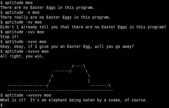 apt-get moo 简单?的确。但这是只会说话的牛,所以惹我们喜欢。再试试“aptitude moo”。他会告诉你“There are no Easter Eggs in this program(这个程序里没有彩蛋)”。 关于 aptitude 有一件事你一定要知道,它是个肮脏、下流的骗子。如果 aptitude 是匹诺曹,那它的鼻子能刺穿月球。在这条命令中添加“-v”选项。不停的添加 v,直到它被逼得投降。