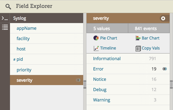 你的第二个选择是使用日志管理系统。好的日志管理系统能自动解析 syslog 消息并抽取错误域。它们也允许你用简单的点击过滤日志消息中的特定错误。 下面是 Loggly 中一个截图,显示了高亮错误严重性的 syslog 域,表示我们正在过滤错误:
