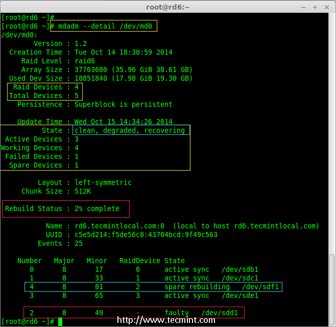 检查 RAID 6 容错 20、 让我们查看 RAID 的详细信息,并检查备用磁盘是否开始同步。