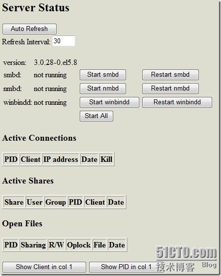 在这个选项中可以启动和停止samba服务,可以查看活动的连接、共享,打开的文件等。