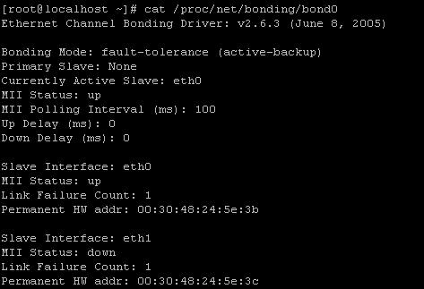 7,尝试拔掉一根网线看是否能正常登陆上去(或ping得通),再查看一下更连接状态(cat /proc/net/bonding/bond0)如下图: