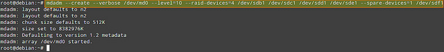 然后使用下面的命令创建一个RAID 10阵列(LCTT 译注:使用了四块磁盘 bcde 创建):